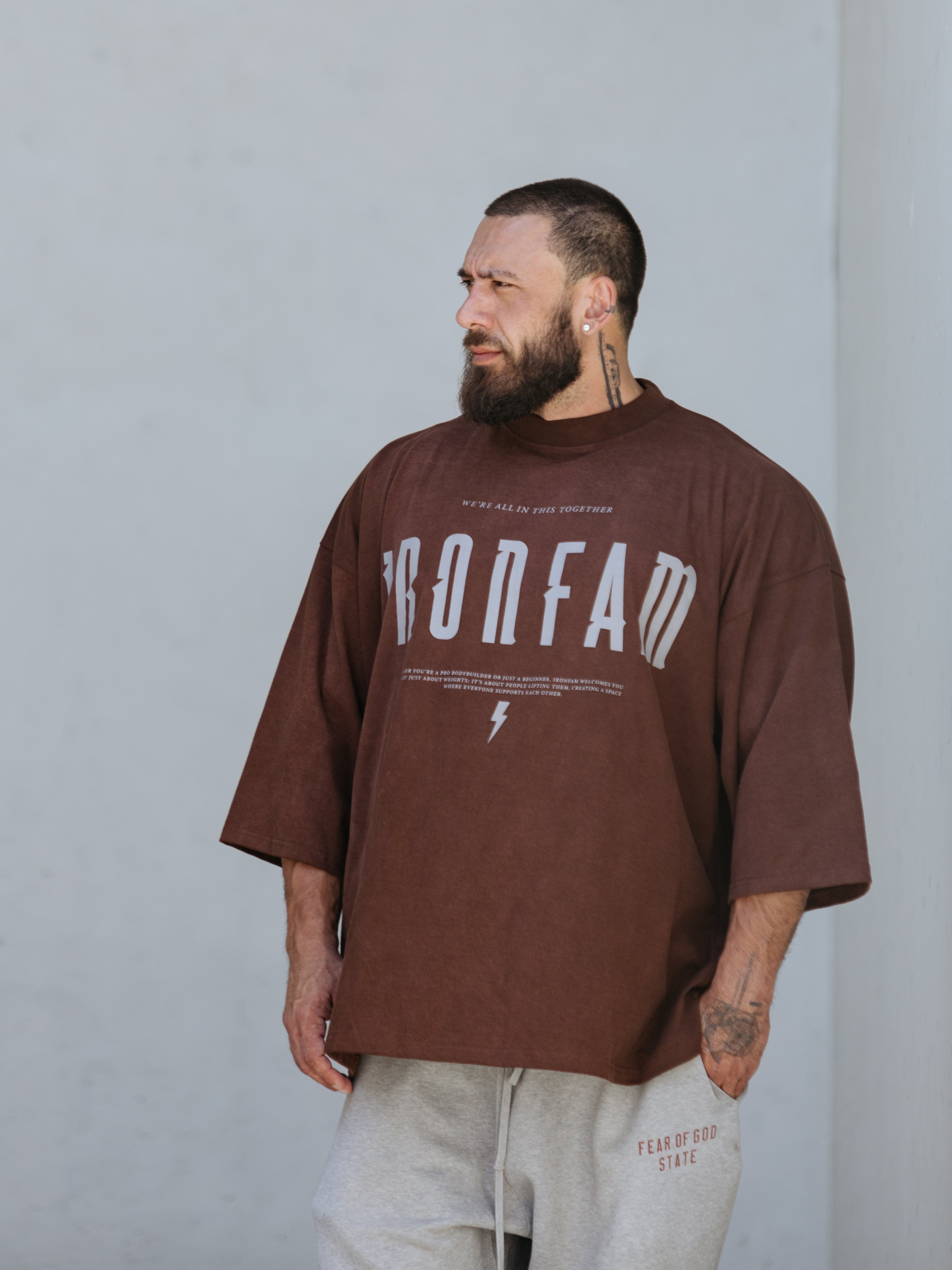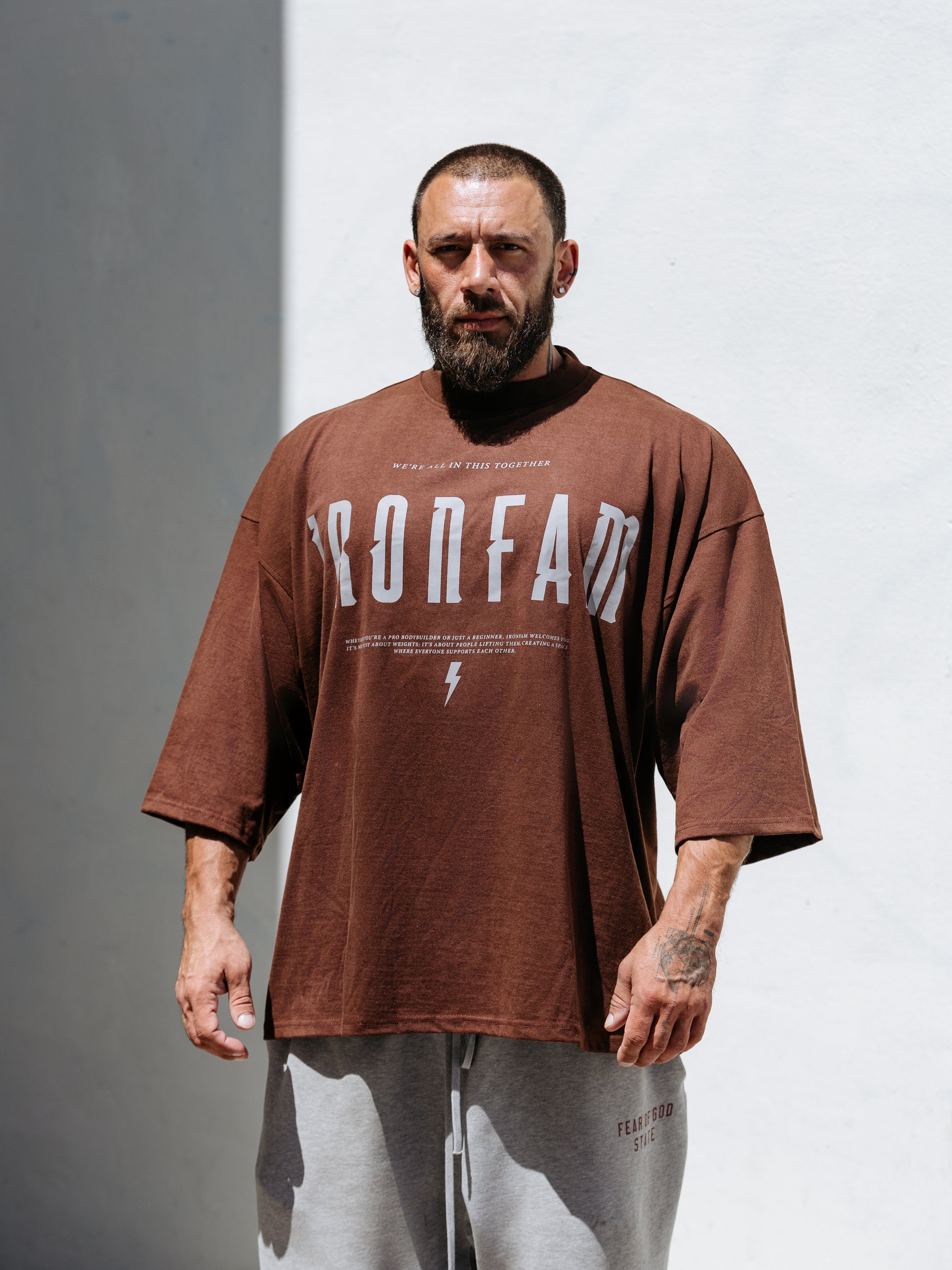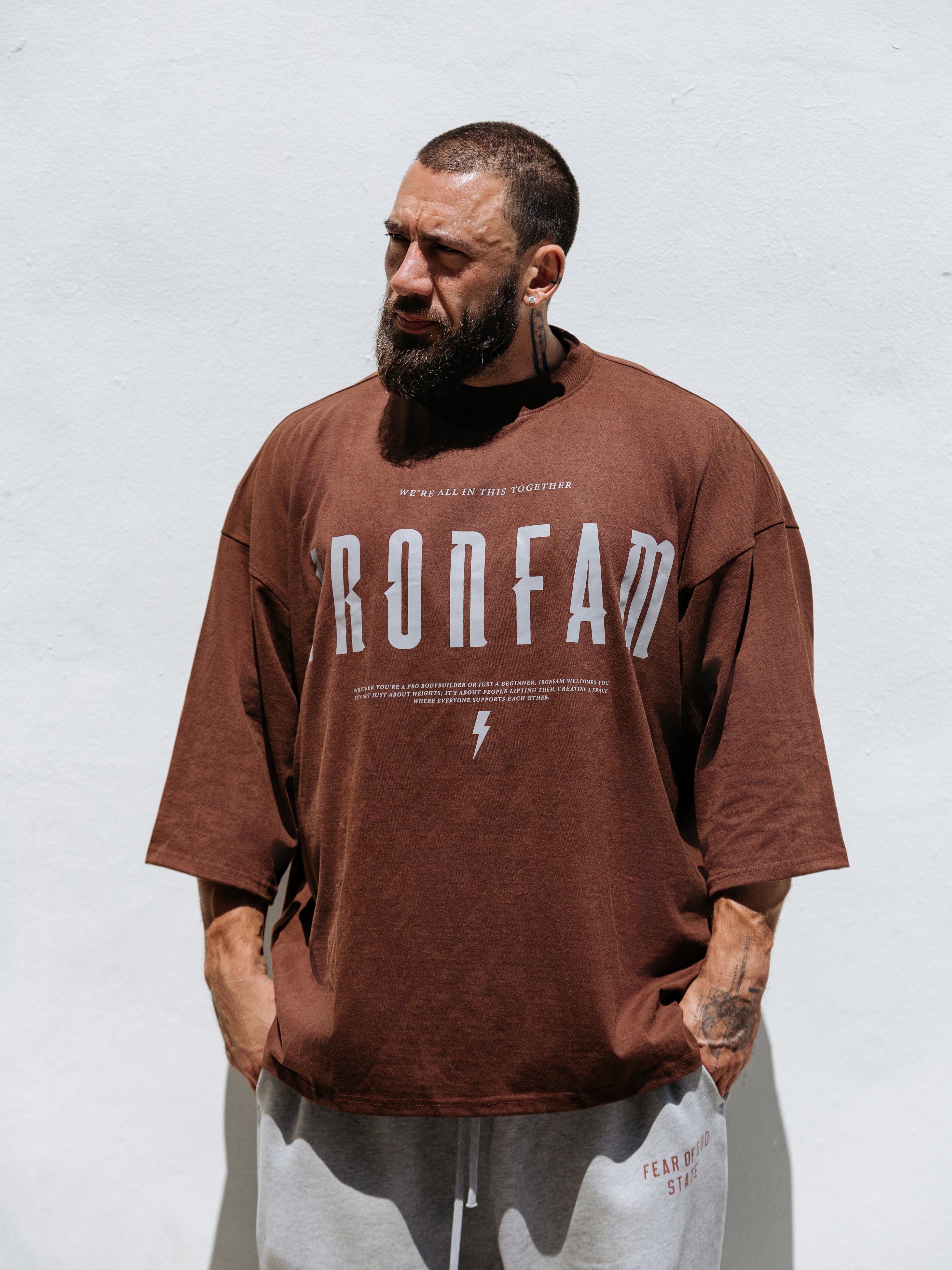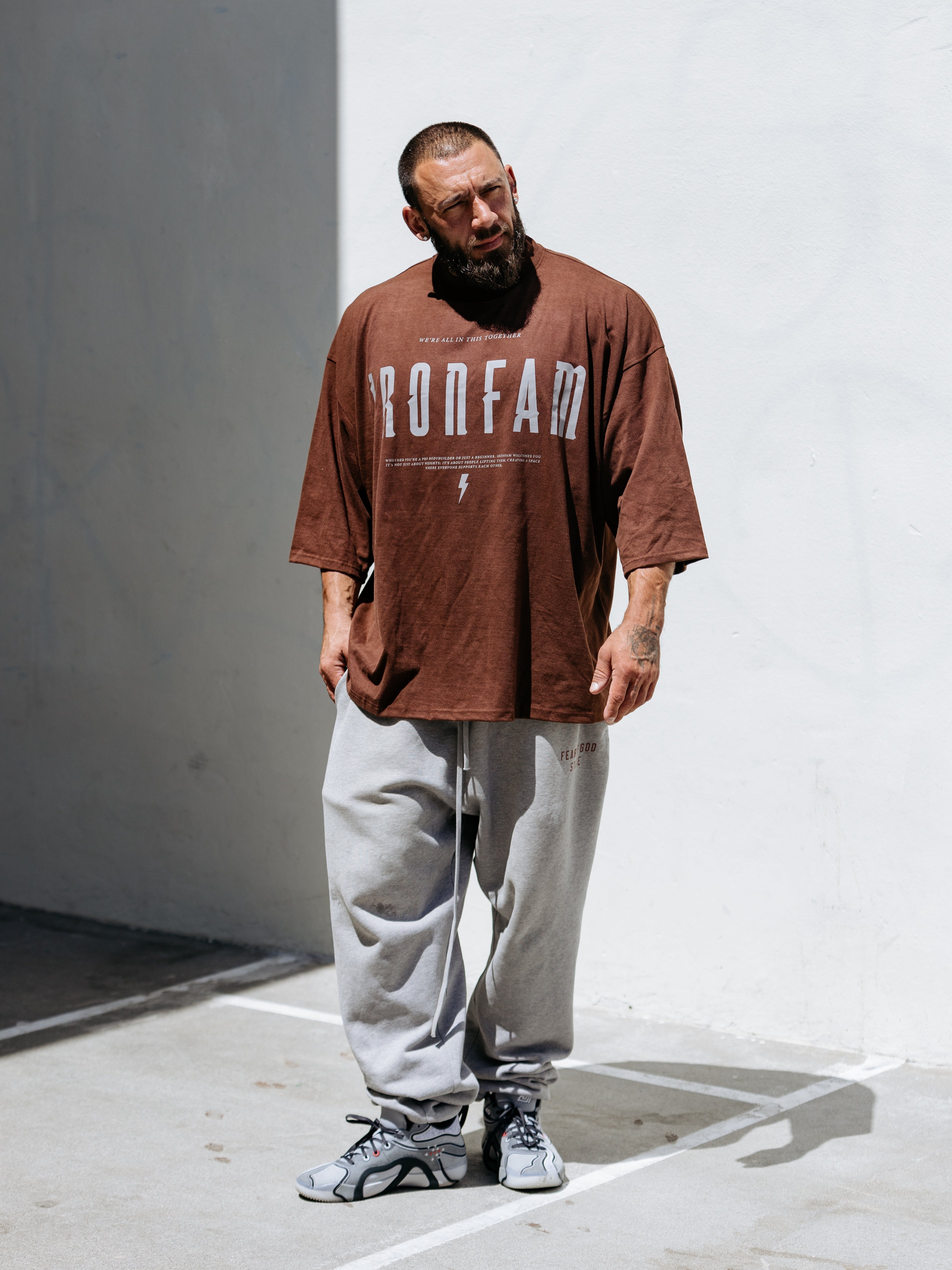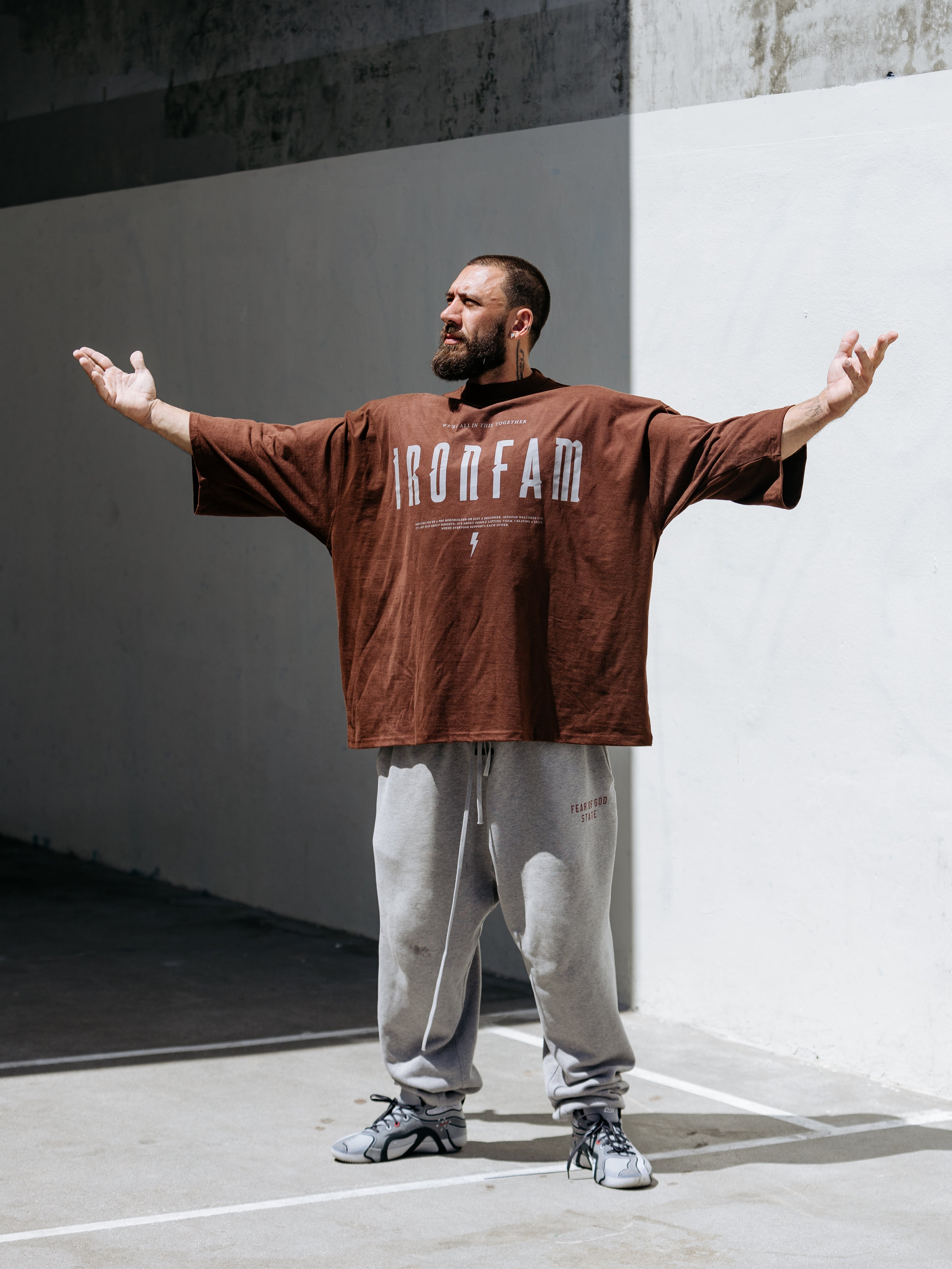 Elevate your gym style with our IRONFAM Pump-Cover T-Shirt, designed specifically for the bodybuilding community. This oversized, baggy style t-shirt is crafted from a high-density 300GSM cotton fabric, ensuring exceptional durability and longevity.