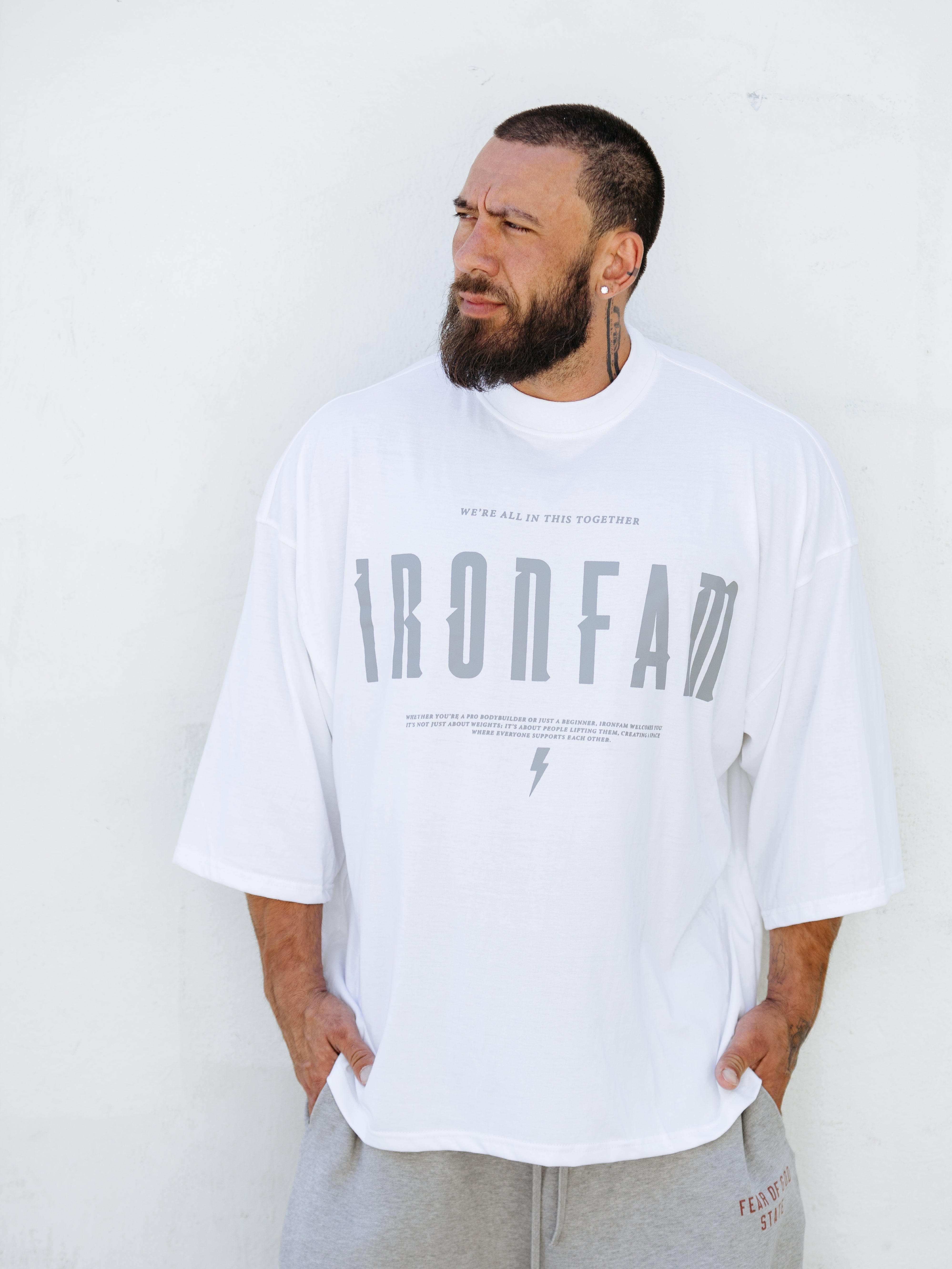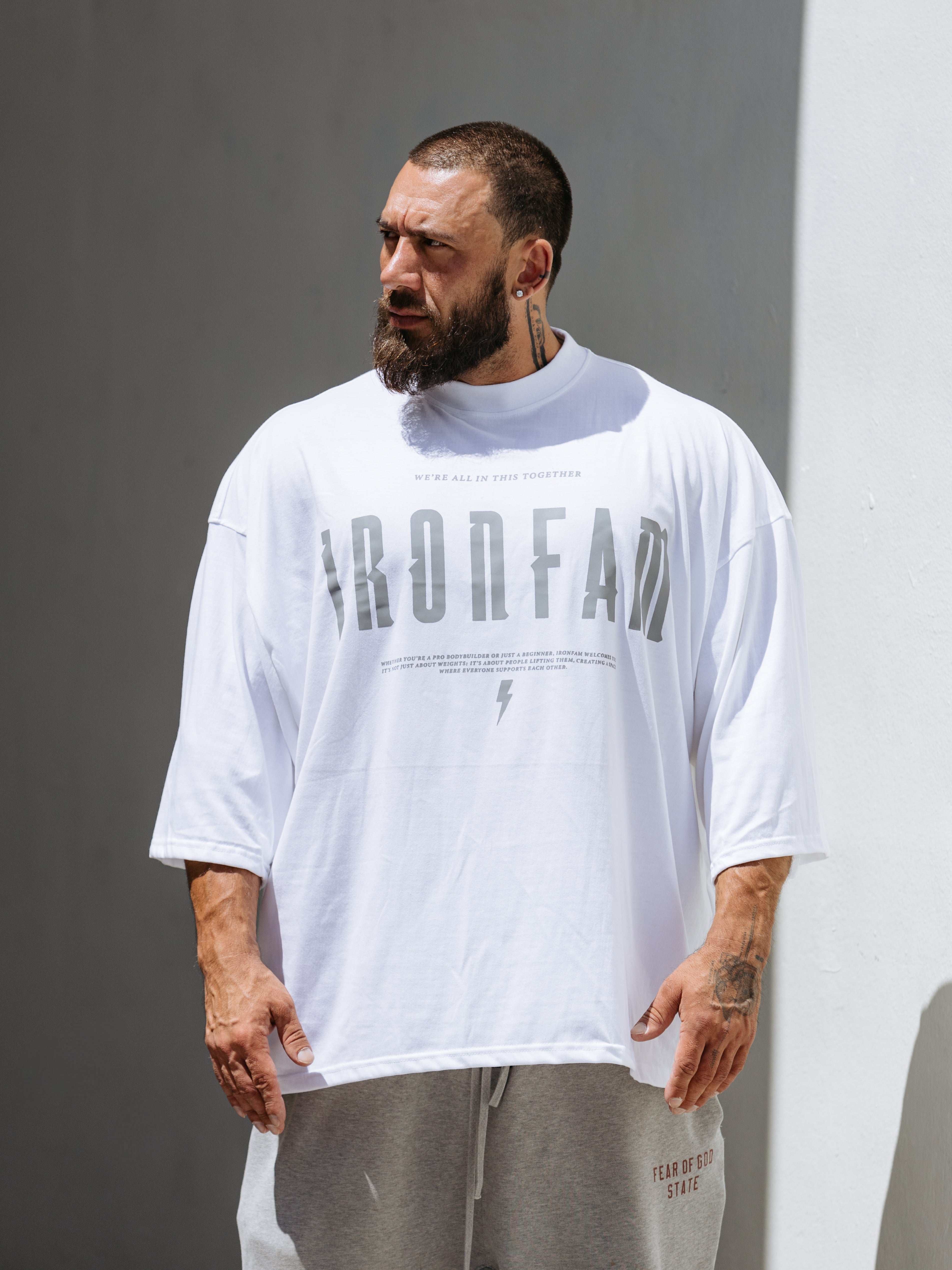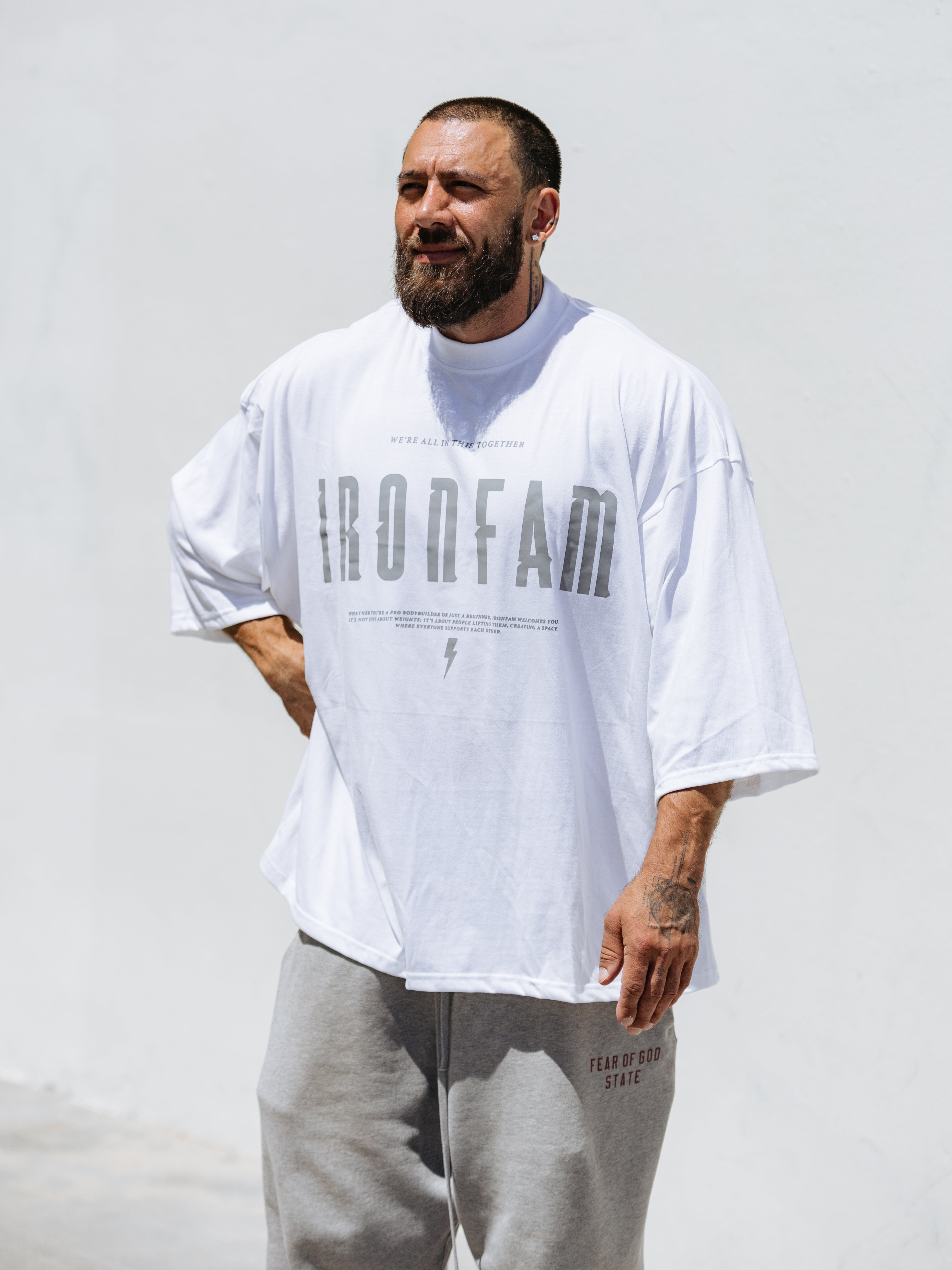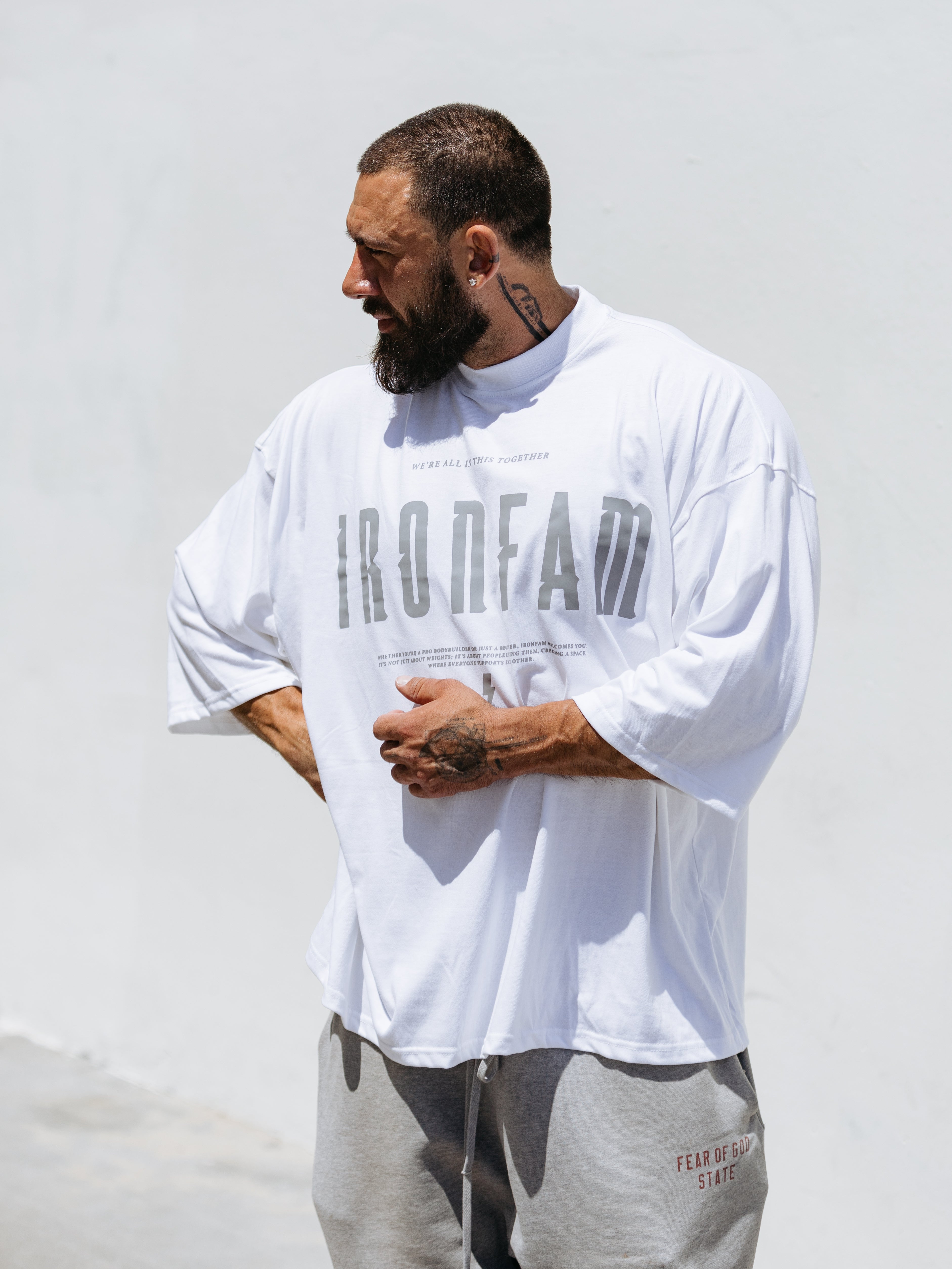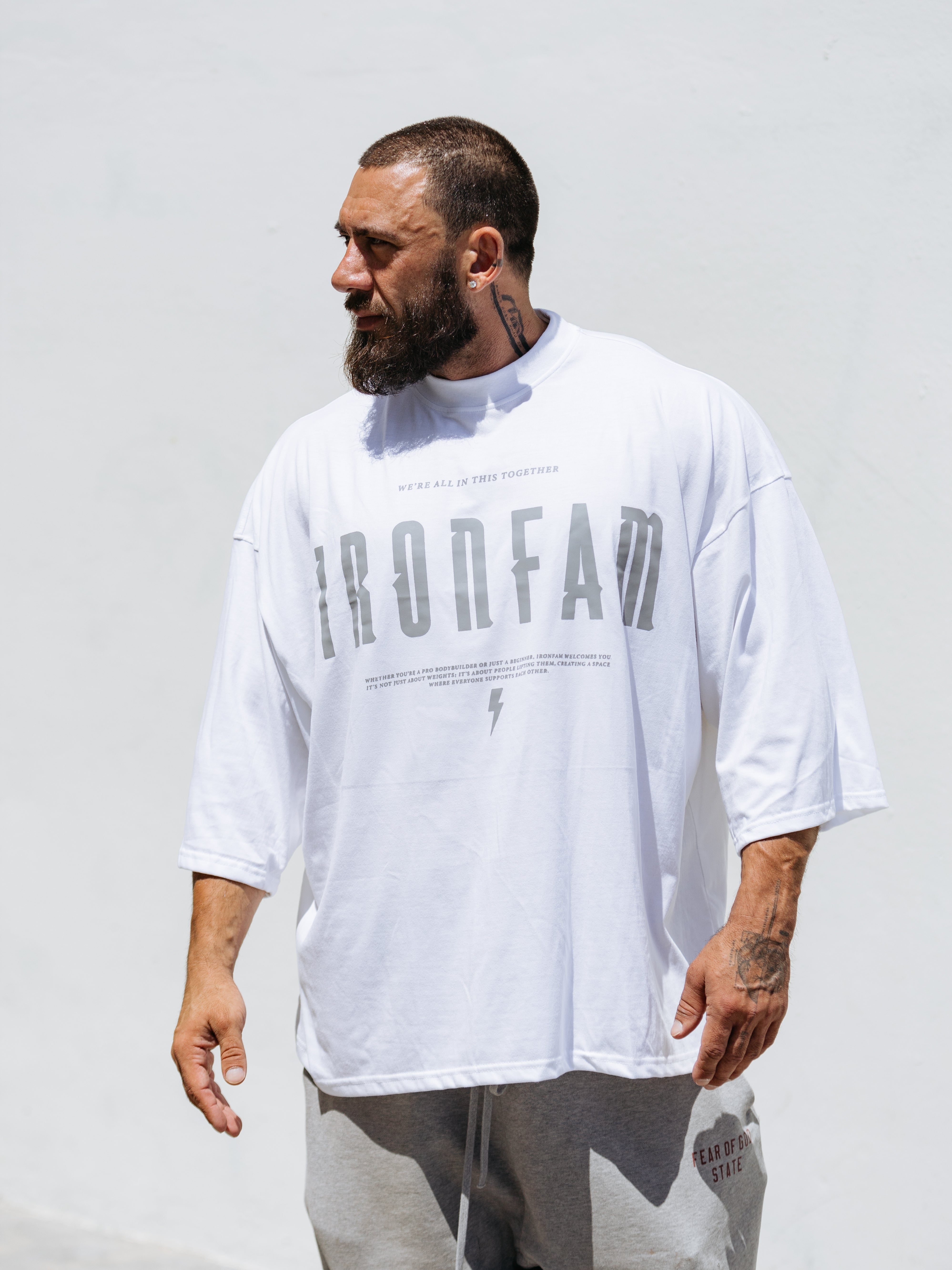 Elevate your gym style with our IRONFAM Pump-Cover T-Shirt, designed specifically for the bodybuilding community. This oversized, baggy style t-shirt is crafted from a high-density 300GSM cotton fabric, ensuring exceptional durability and longevity.