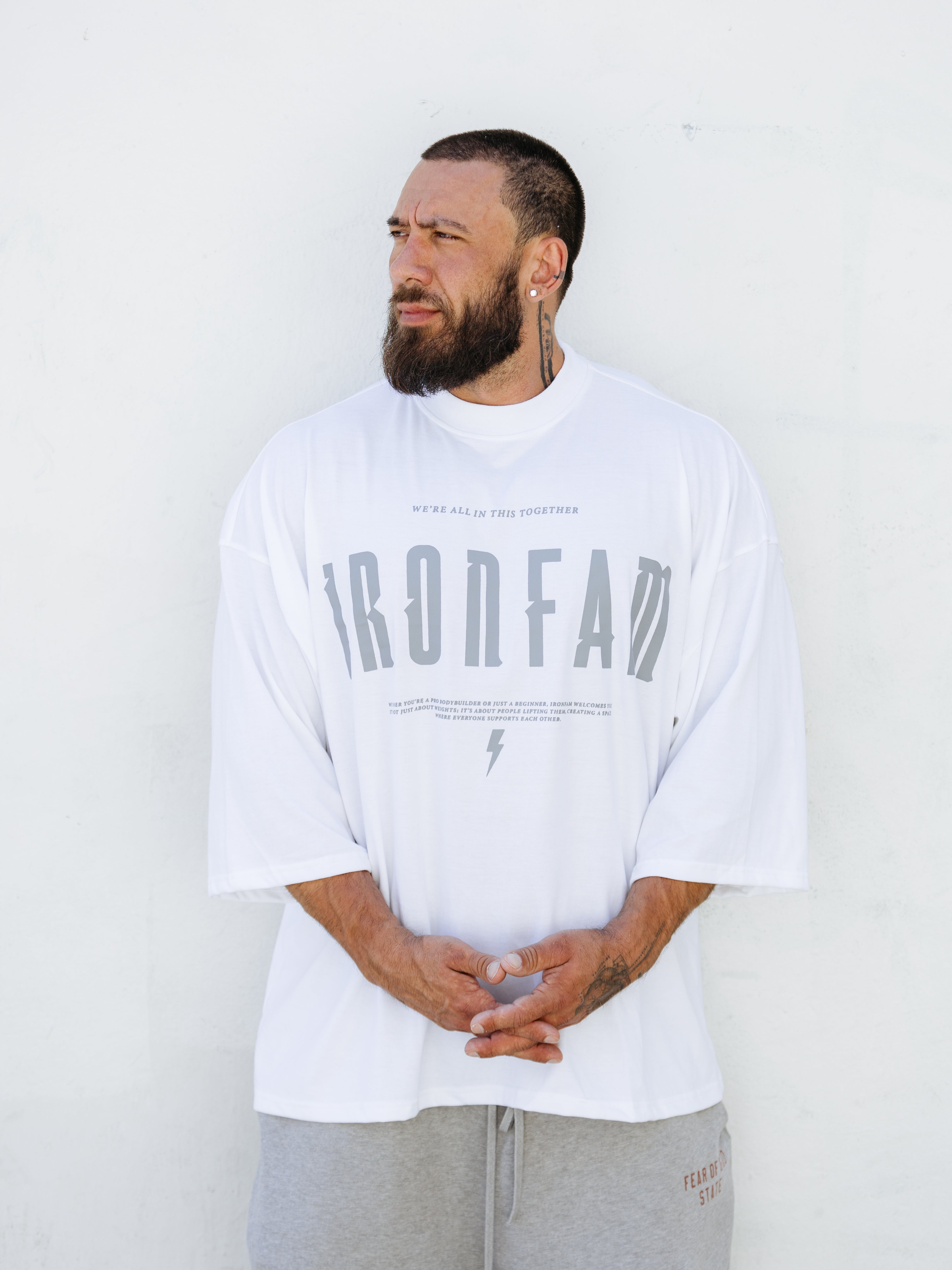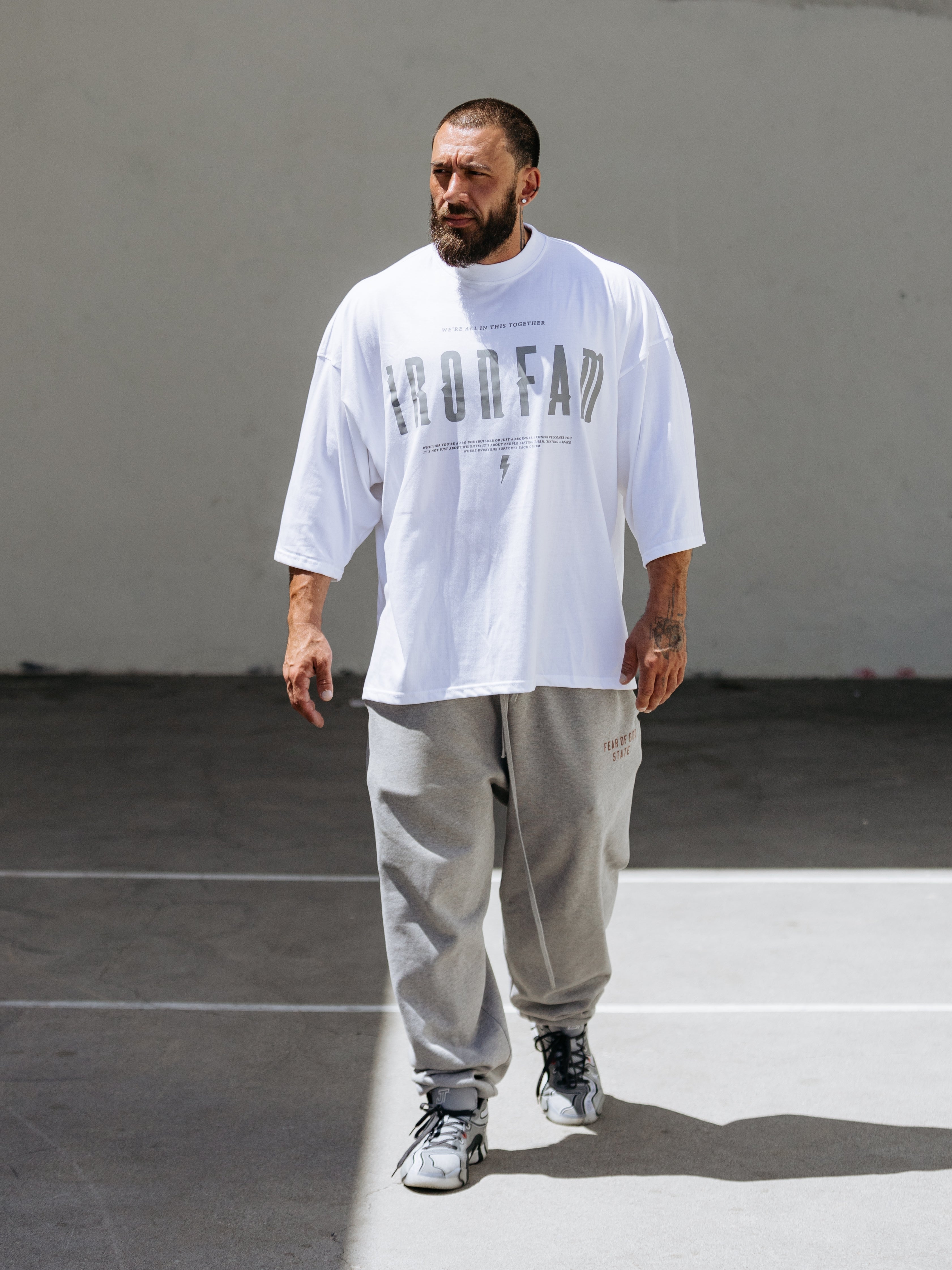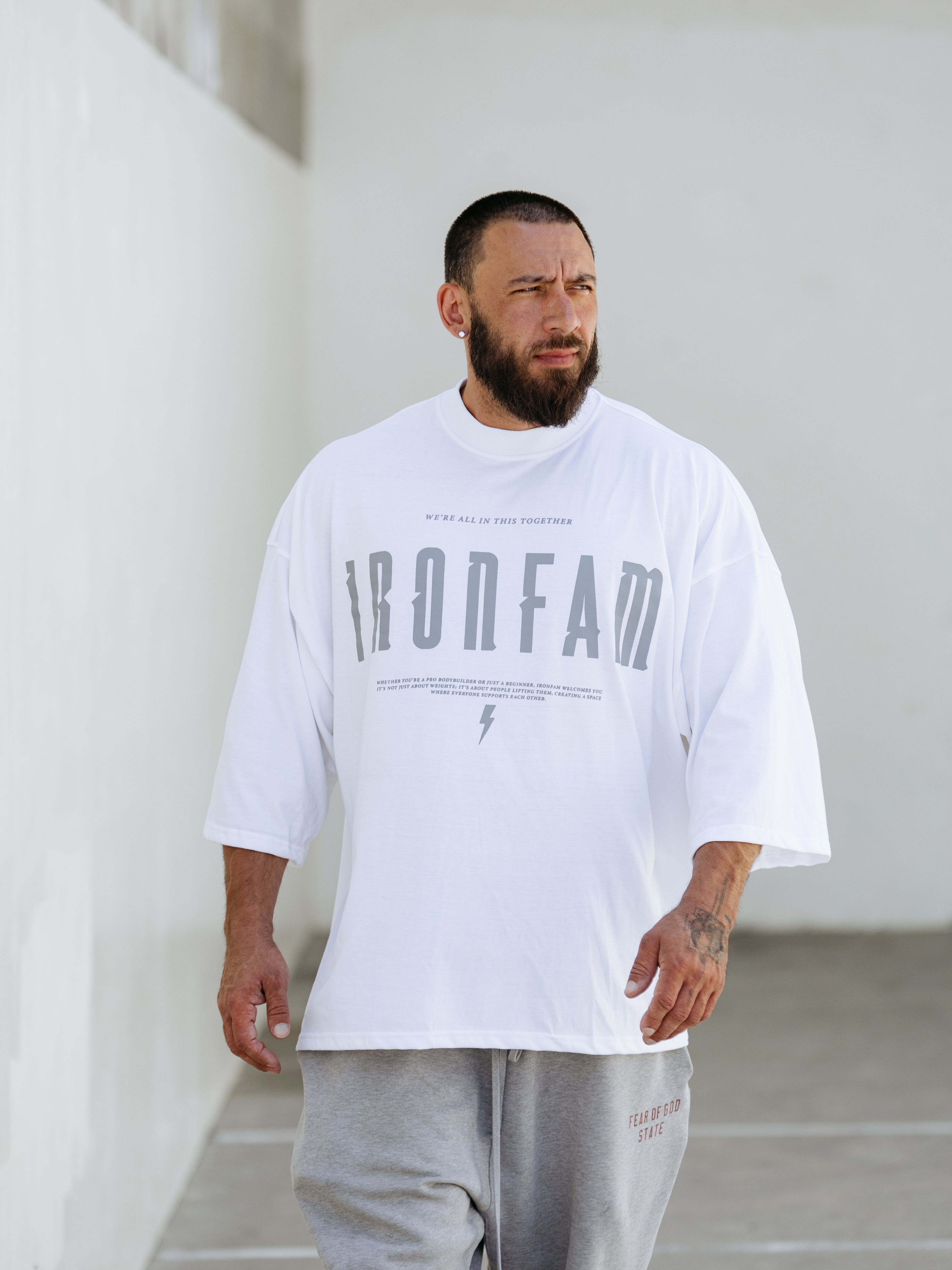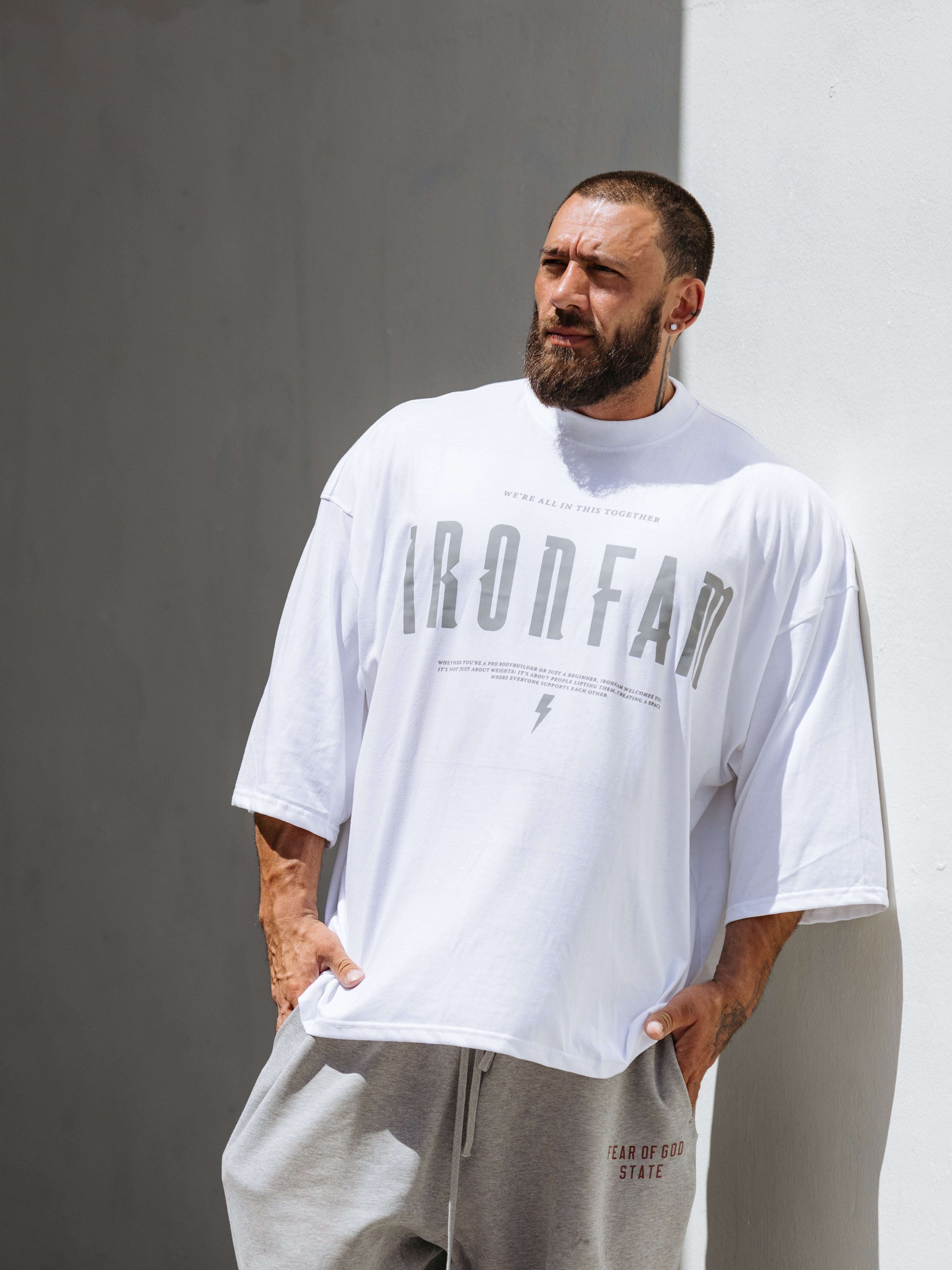 Elevate your gym style with our IRONFAM Pump-Cover T-Shirt, designed specifically for the bodybuilding community. This oversized, baggy style t-shirt is crafted from a high-density 300GSM cotton fabric, ensuring exceptional durability and longevity.