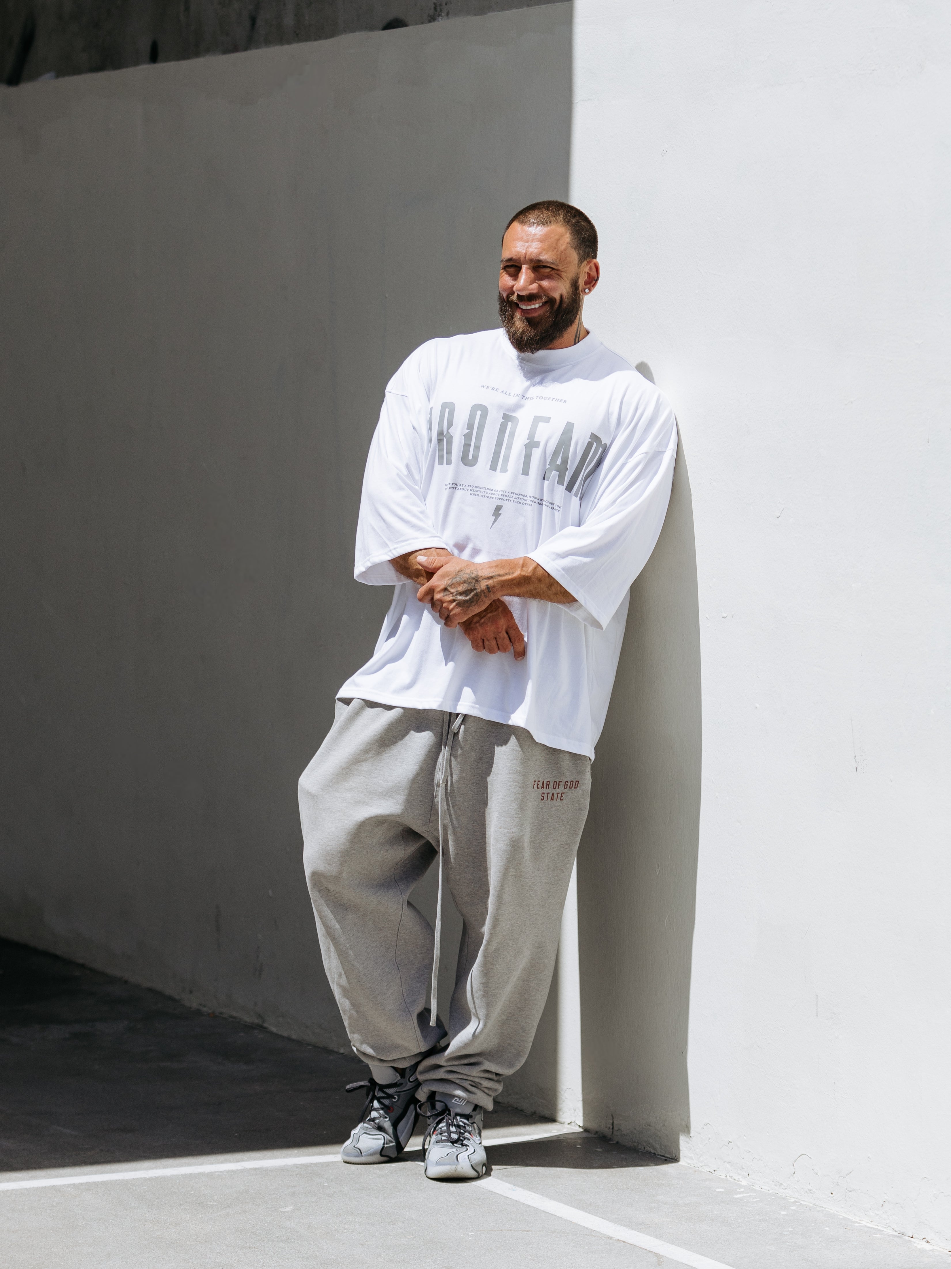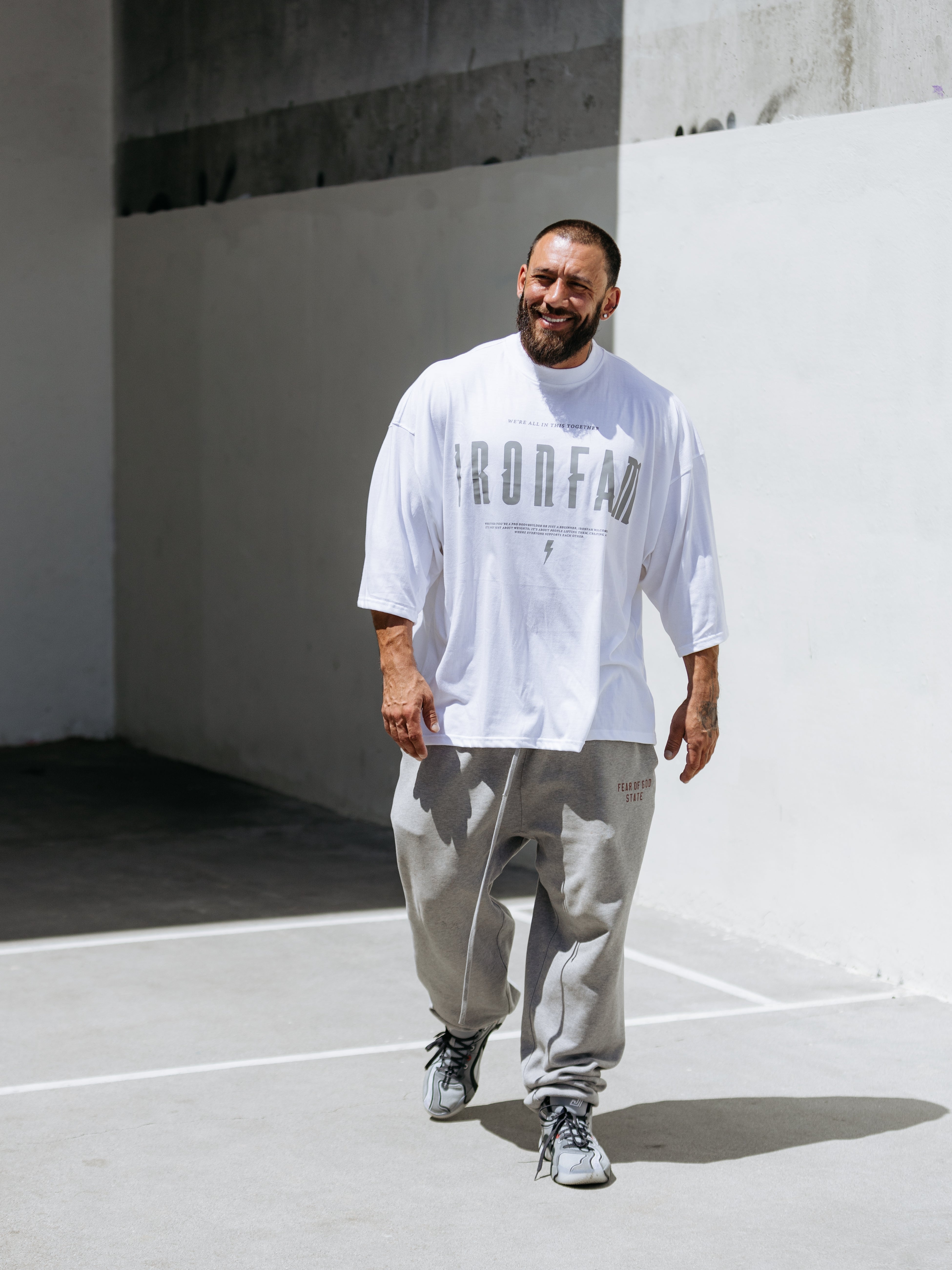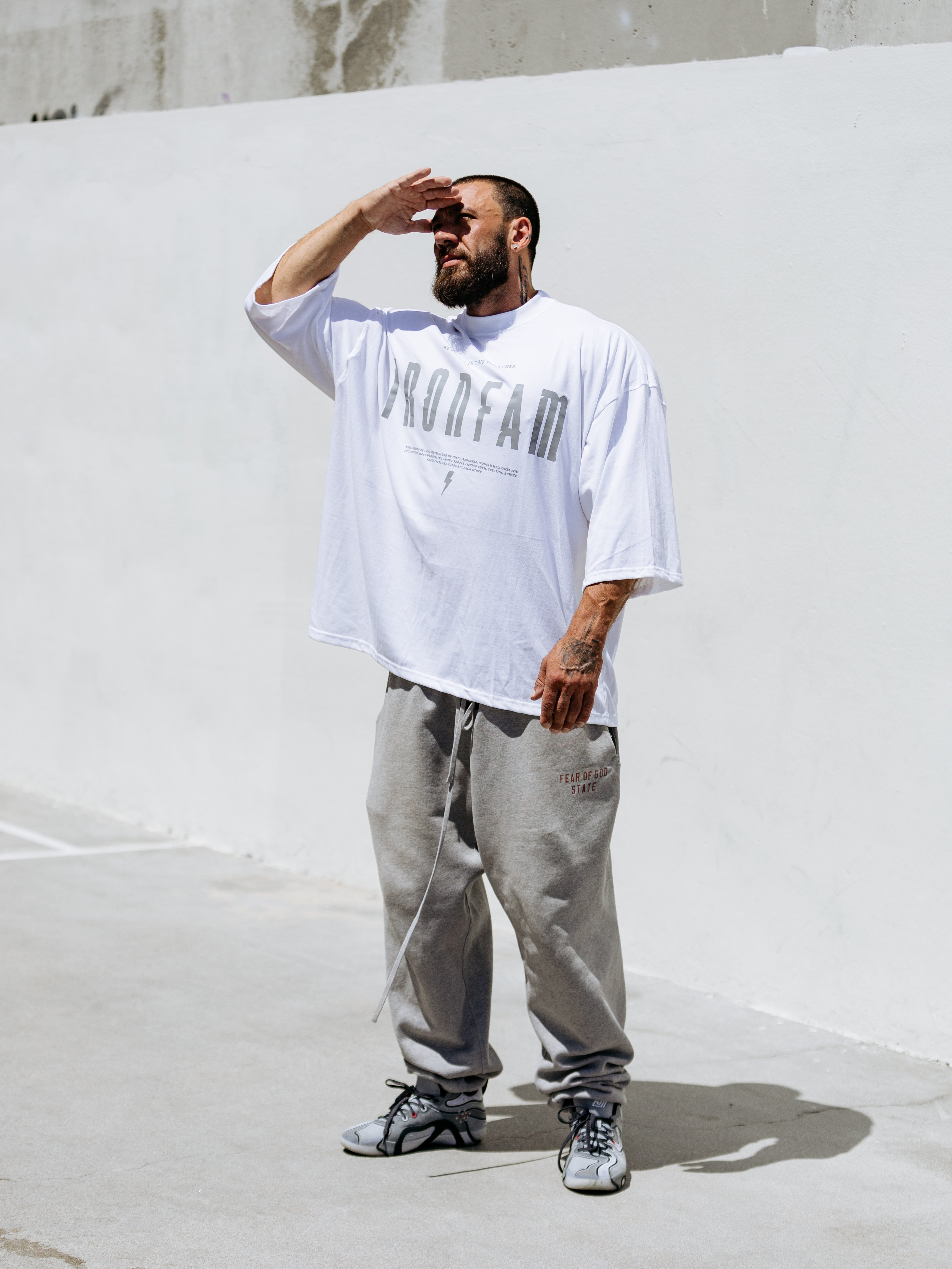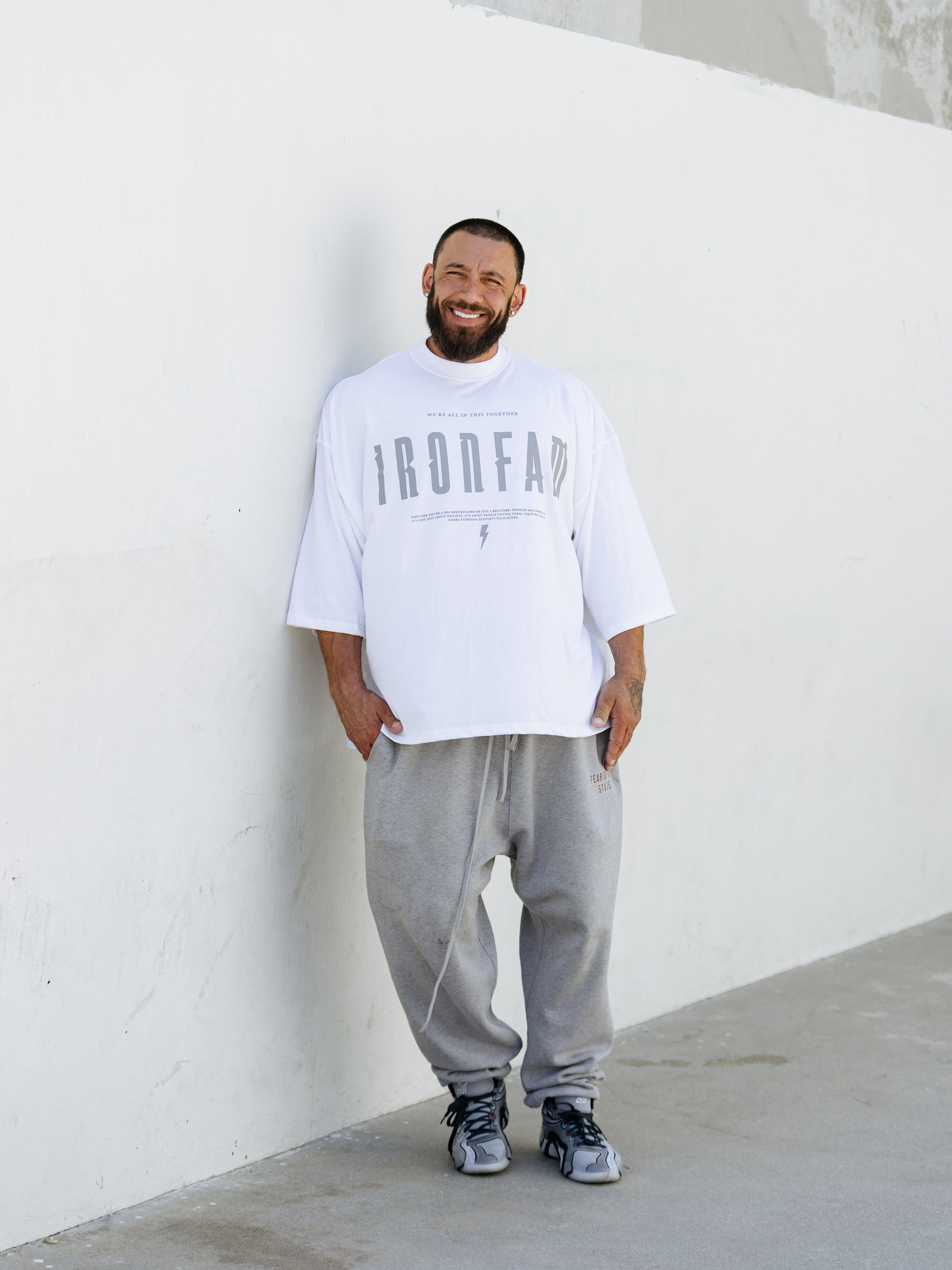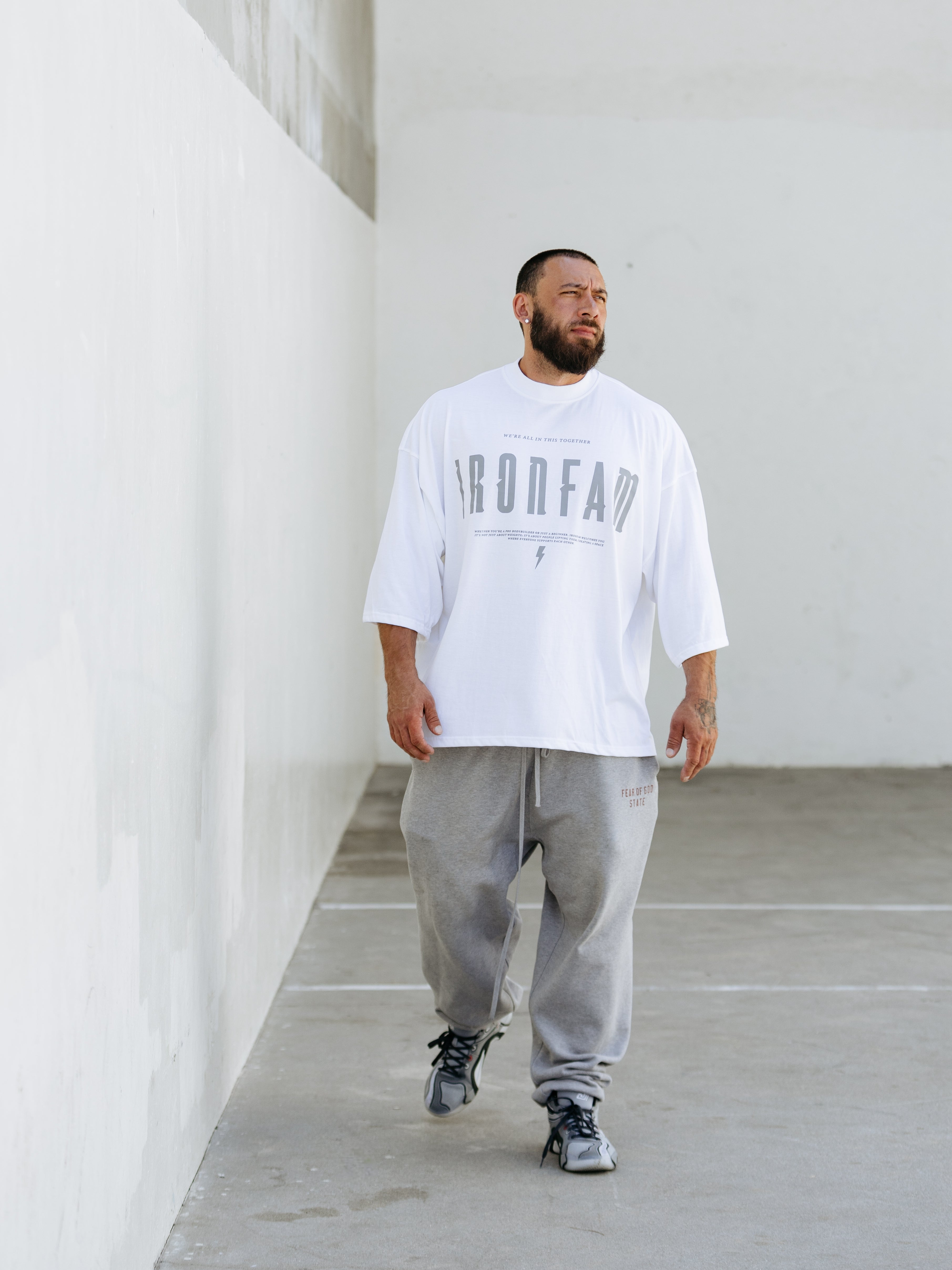 Elevate your gym style with our IRONFAM Pump-Cover T-Shirt, designed specifically for the bodybuilding community. This oversized, baggy style t-shirt is crafted from a high-density 300GSM cotton fabric, ensuring exceptional durability and longevity.