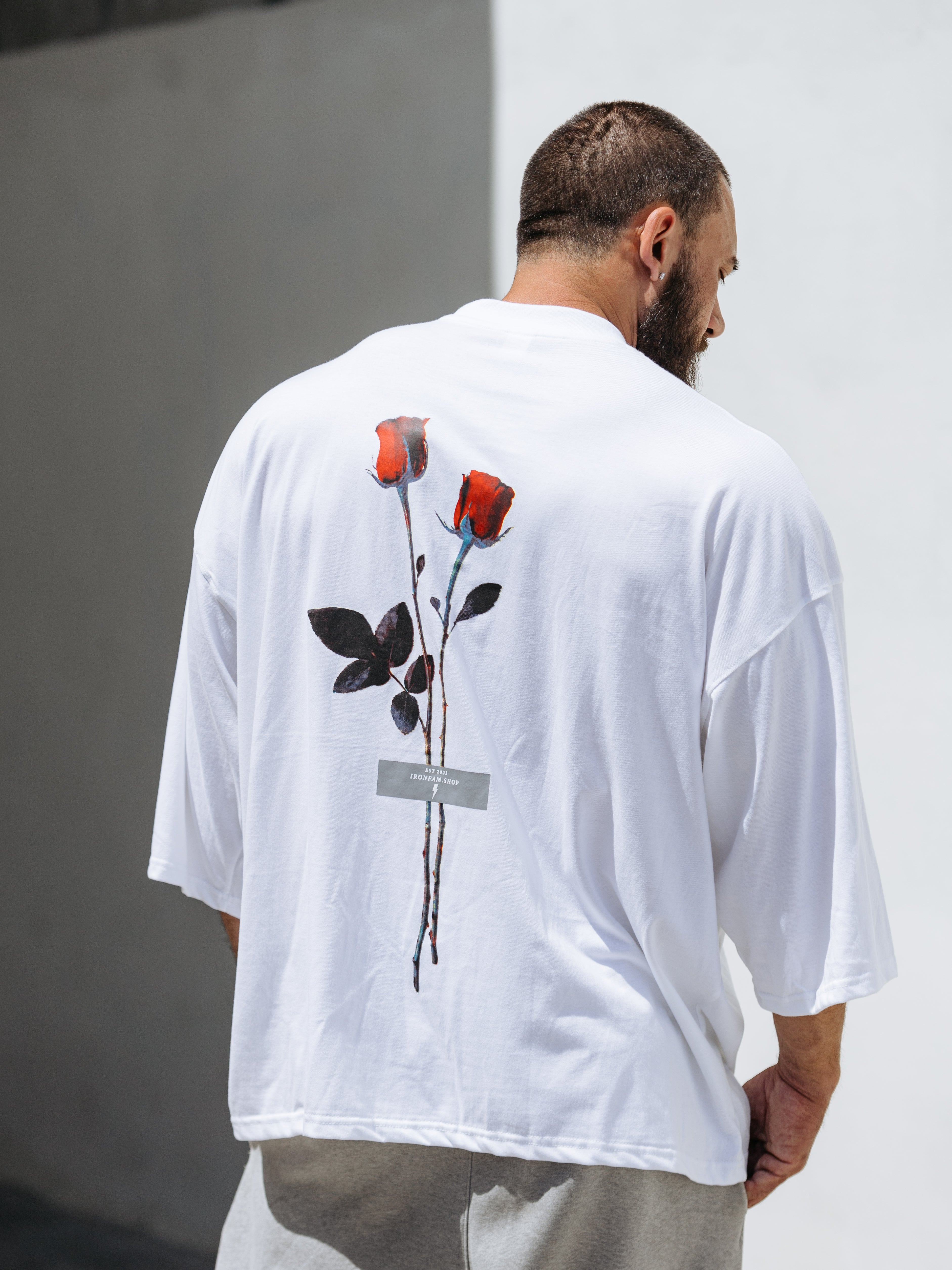 The bold "IRONFAM: We're All in This Together" print on the chest embodies our brand's core message of community and support. On the back, a striking rose graphic symbolizes the balance of power and aesthetics, reflecting the essence of strength training.